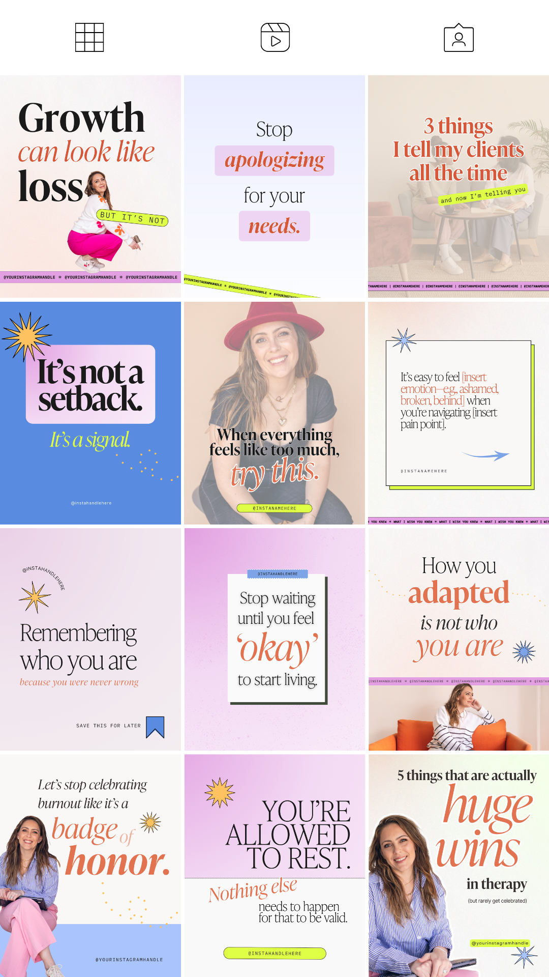 Every month, get a fresh set of branded Therapist Template Club templates—social posts, carousels, graphics, and campaigns—so you can stay consistent without starting from scratch.